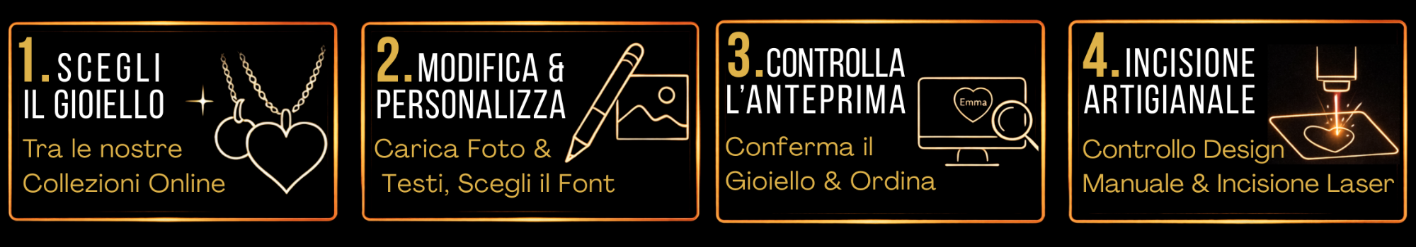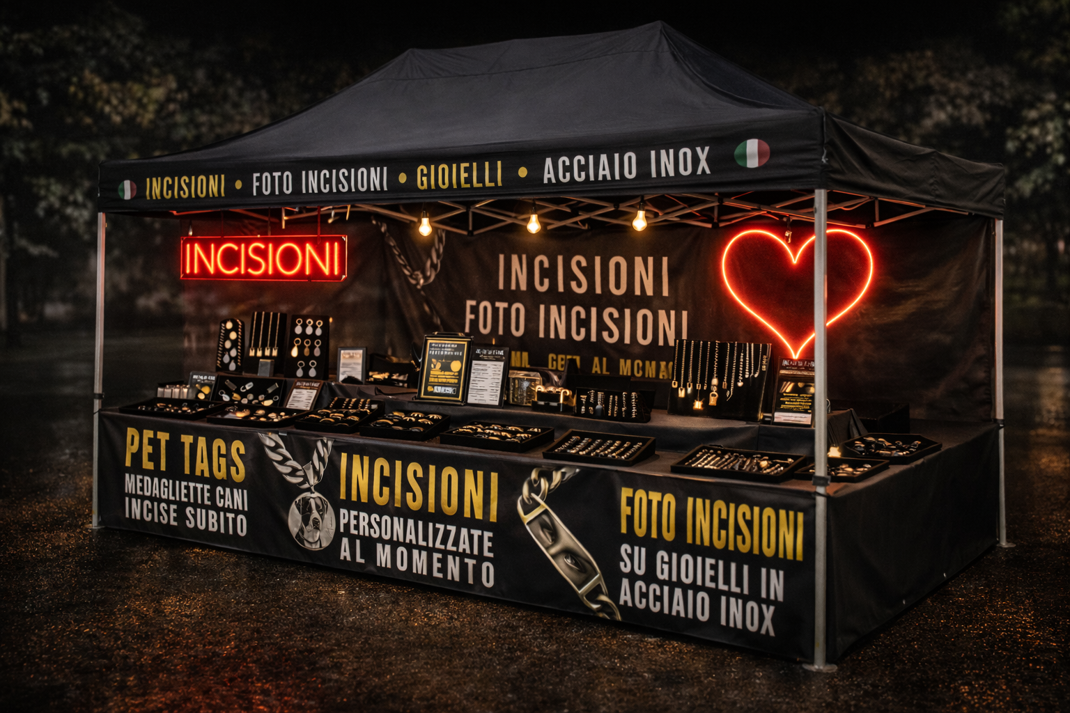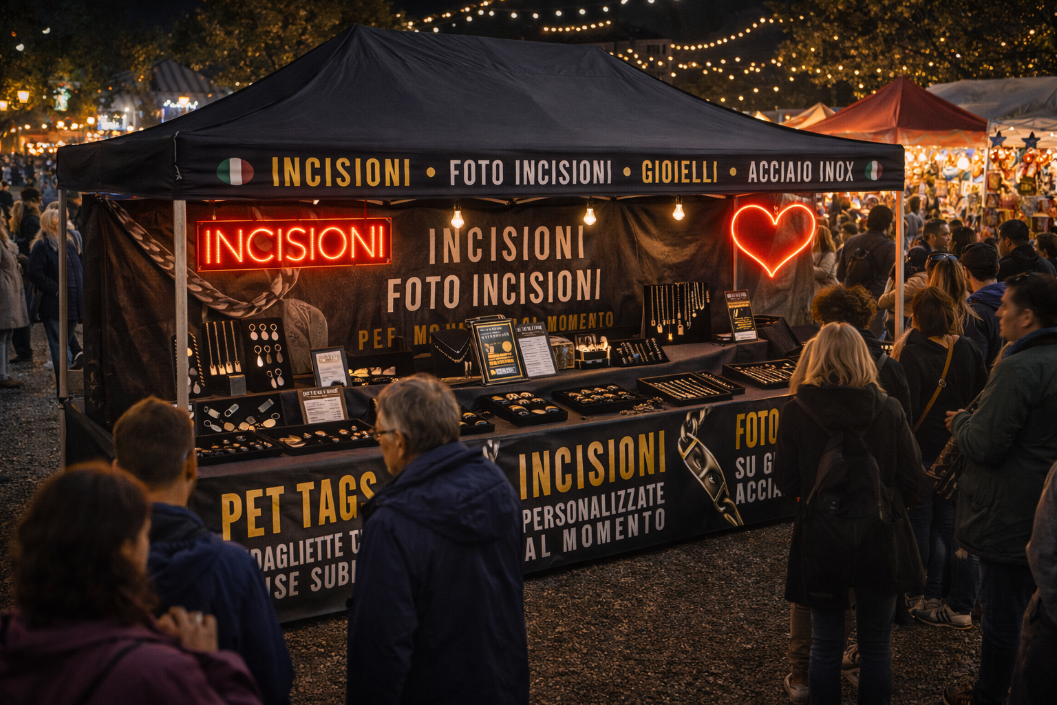Operiamo online e dal vivo in fiere, eventi e manifestazioni, offrendo incisioni e foto-incisioni di precisione su gioielli, oggetti di design, articoli regalo e soluzioni corporate. Ogni lavorazione nasce dall’incontro tra tecnologia laser avanzata e sensibilità artigianale, per creare pezzi esclusivi, curati in ogni dettaglio.